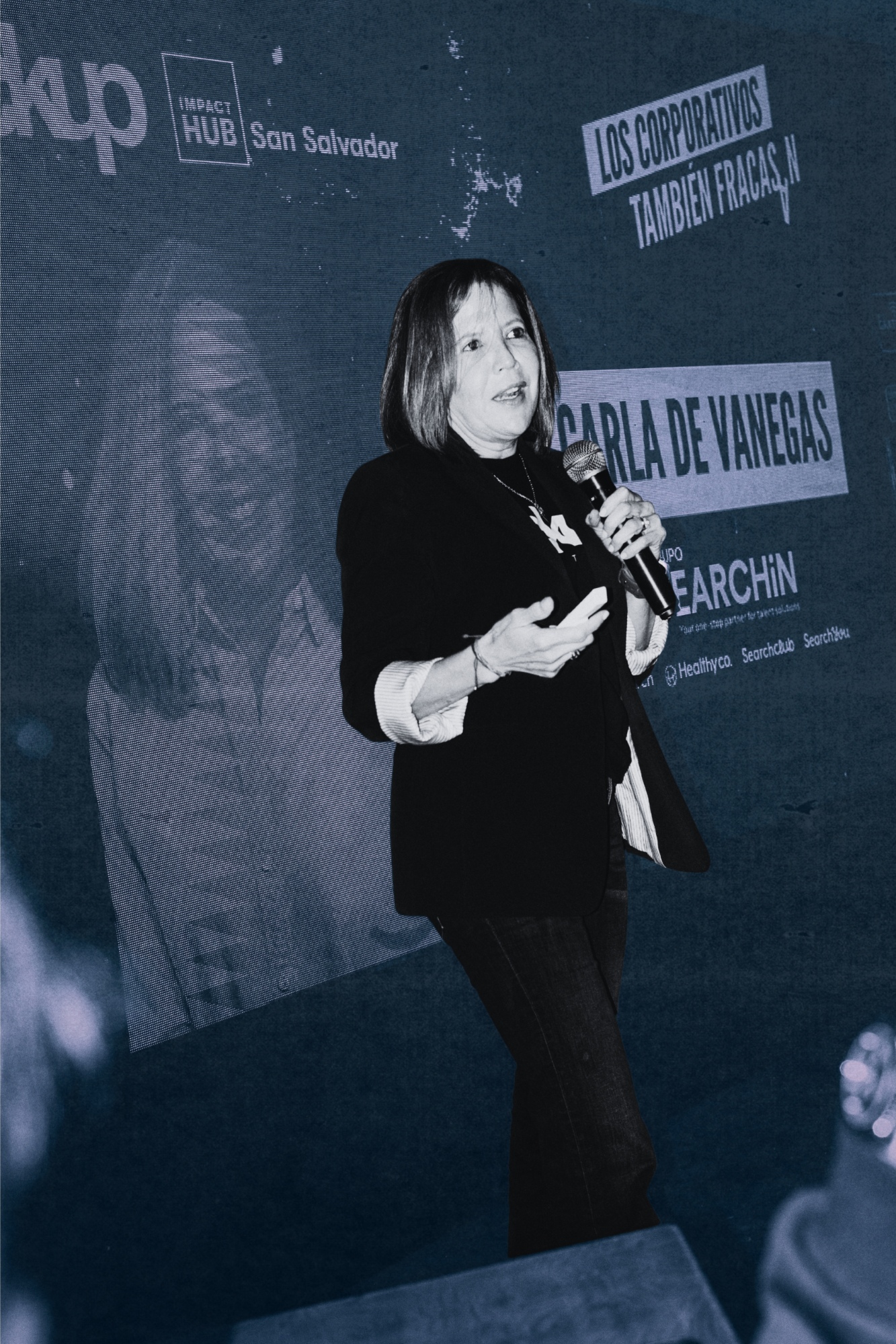 El panel reunió a tres líderes empresariales de larga trayectoria. Todos con historias de innovación, crecimiento y caídas. Carla de Vanegas, vicepresidenta del Grupo Searchin, fue la primera en pasar al escenario. Su carrera está marcada por proyectos pioneros como Tecoloco.com, la primera bolsa de empleo en línea de Centroamérica, y más tarde por iniciativas como Joven360, Search Club Lat y Healthy Company. Pero esa noche no vino a hablar de logros.